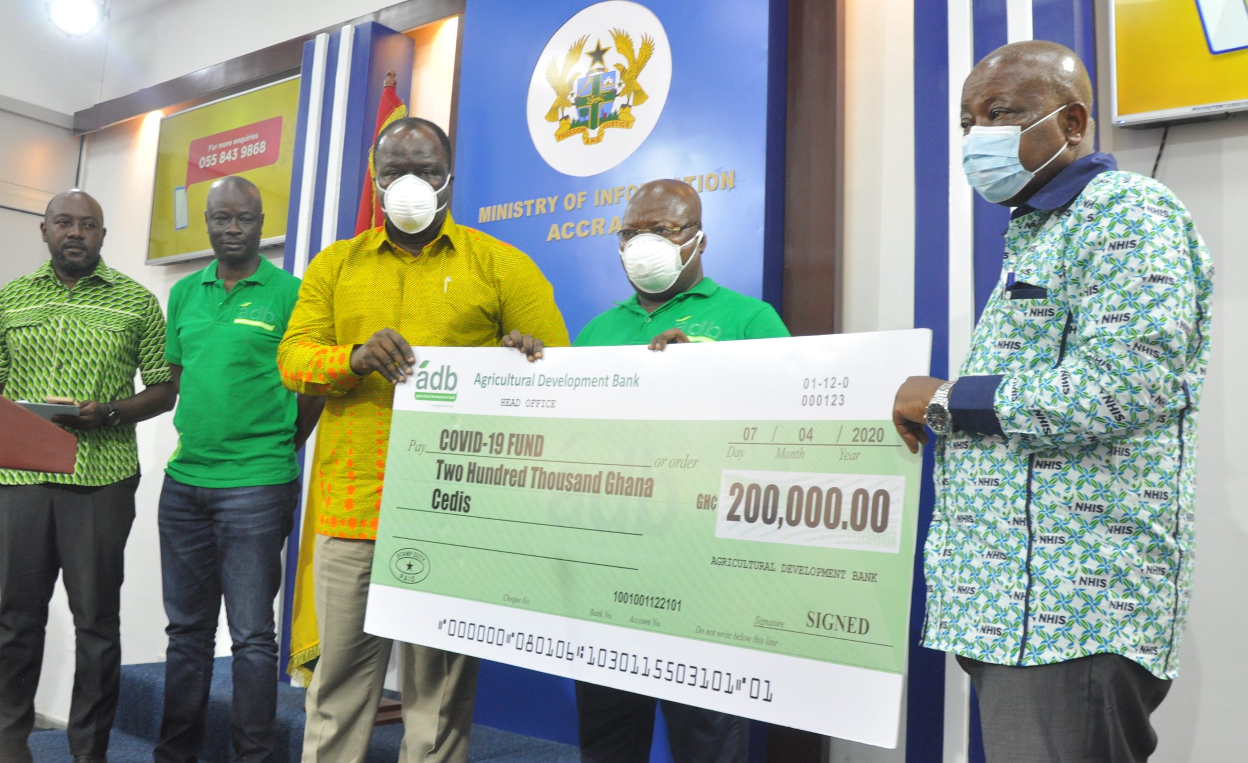 The Managing Director of Agricultural Development Bank (ADB), Dr. John Kofi Mensah has presented a cheque donation of Two Hundred Thousand Ghana Cedis to the COVID-19 Trust Fund.