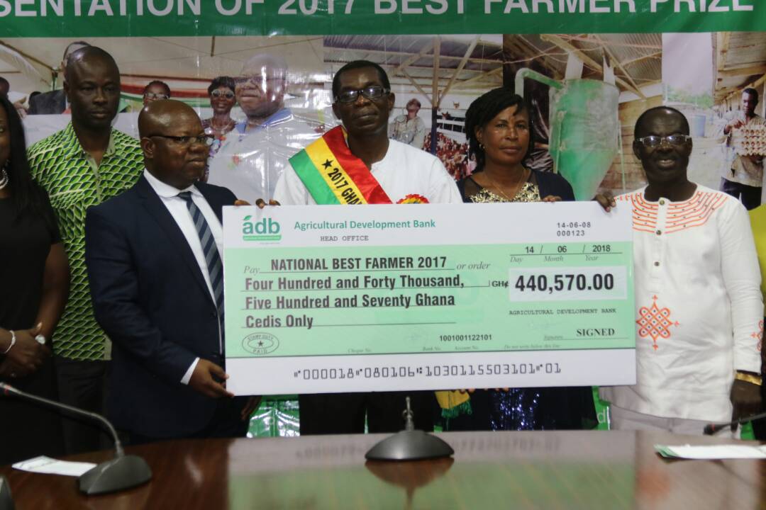 The Agricultural Development Bank (ADB) has fulfilled its sponsorship obligation to the 2017 National Best Farmer, Mr. Philip Kwaku Agyemang with the presentation of a cheque for Four Hundred and Forty Thousand Five Hundred and Seventy Ghana Cedis (GH¢440,570.00).