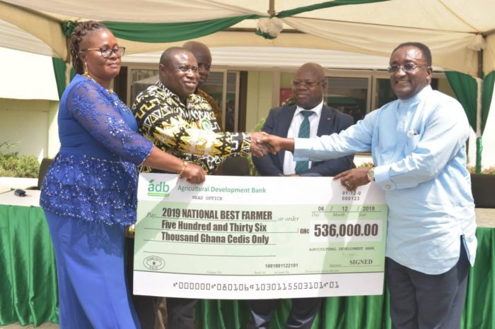The Agricultural Development Bank (ADB) has handed over the prize package to the Charles Gyamfi, the 2019 National Best Farmer, in the courtyard of the Ministry of Food and Agriculture (MoFA) in Accra.